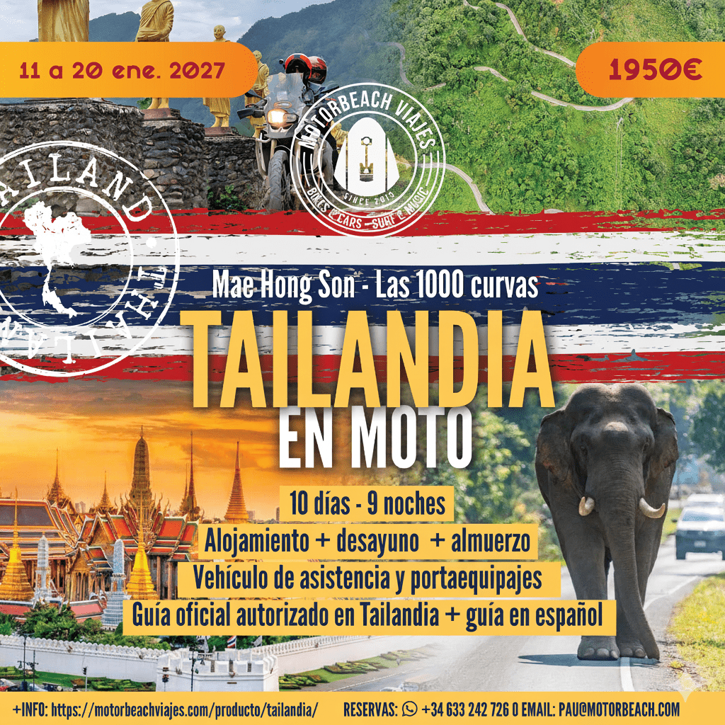 • Tailandia — El Mae Hong Son loop, una de las rutas moteras más famosas del planeta con más de 4.000 curvas registradas. Templos, cascadas, santuarios de elefantes y gastronomía thai. Uno de los destinos más cómodos y agradables que existen sobre dos ruedas.